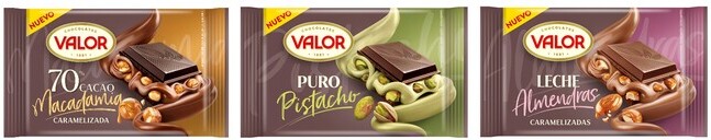 • Las nuevas tabletas de Chocolates Valor llegan con tres exclusivas recetas que ofrecen una experiencia premium y llena de nuevas sensaciones, con los mejores cacaos y exquisitos rellenos con trozos de frutos secos: 70% cacao y macadamia, Chocolate Puro con pistacho y chocolate con leche y almendras caramelizadas.